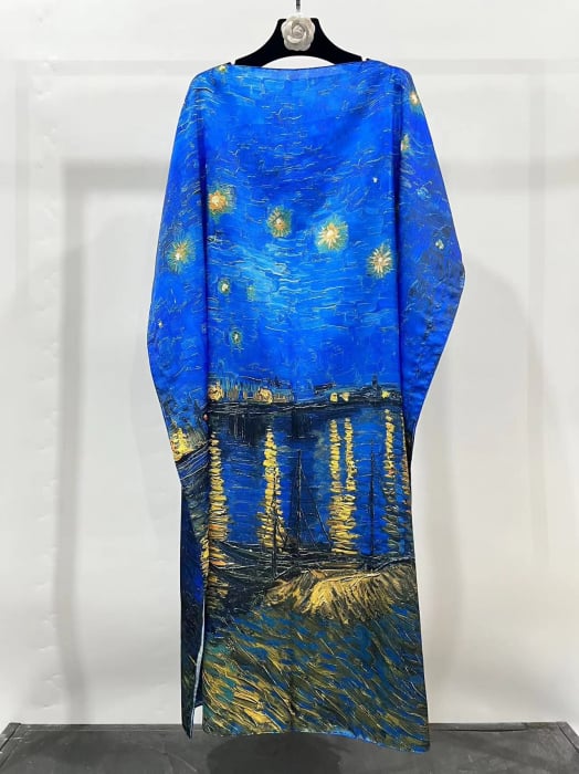 Transformă-ți stilul estival cu această rochie de plajă lungă tip poncho, realizată din matase 100%. Inspirată de capodopera lui Claude Monet, Noapte Instelată deasupra Rhonului, această rochie îmbină eleganța artistică cu confortul necesar zilelor de vară.